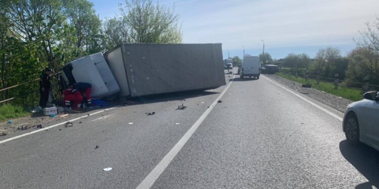 Аварія на автошляху неподалік Романівки. Зіткнулися вантажівка та легковий автомобіль. Фура перегородила дорогу.